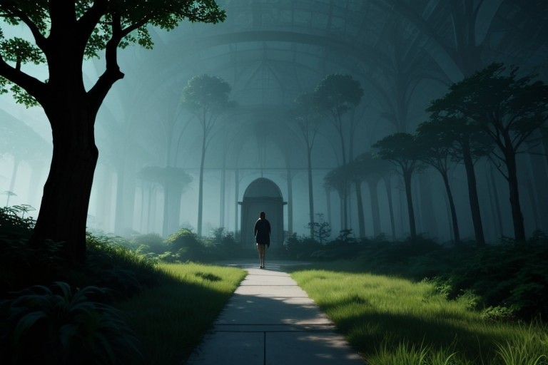 A futuristic greenhouse filled with exotic, bioluminescent plants, with never-before-seen species glowing in shades of blue, green, and purple. Floating glass pathways wind through the giant trees, and drones hover in the air, tending to the plants. Soft sunlight filters through the glass dome, reflecting the vibrant colors of the leaves