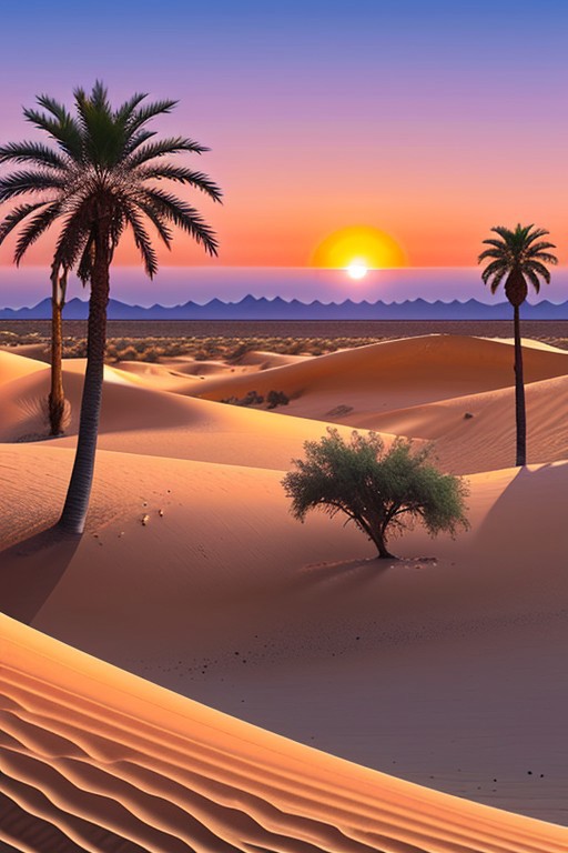 A tranquil desert oasis surrounded by tall palm trees and crystal-clear water. The sun is setting, casting a golden glow over the sand dunes in the distance. Camels are resting near the water, and the air is still and warm. The sky is a mix of orange, pink, and purple hues as night approaches