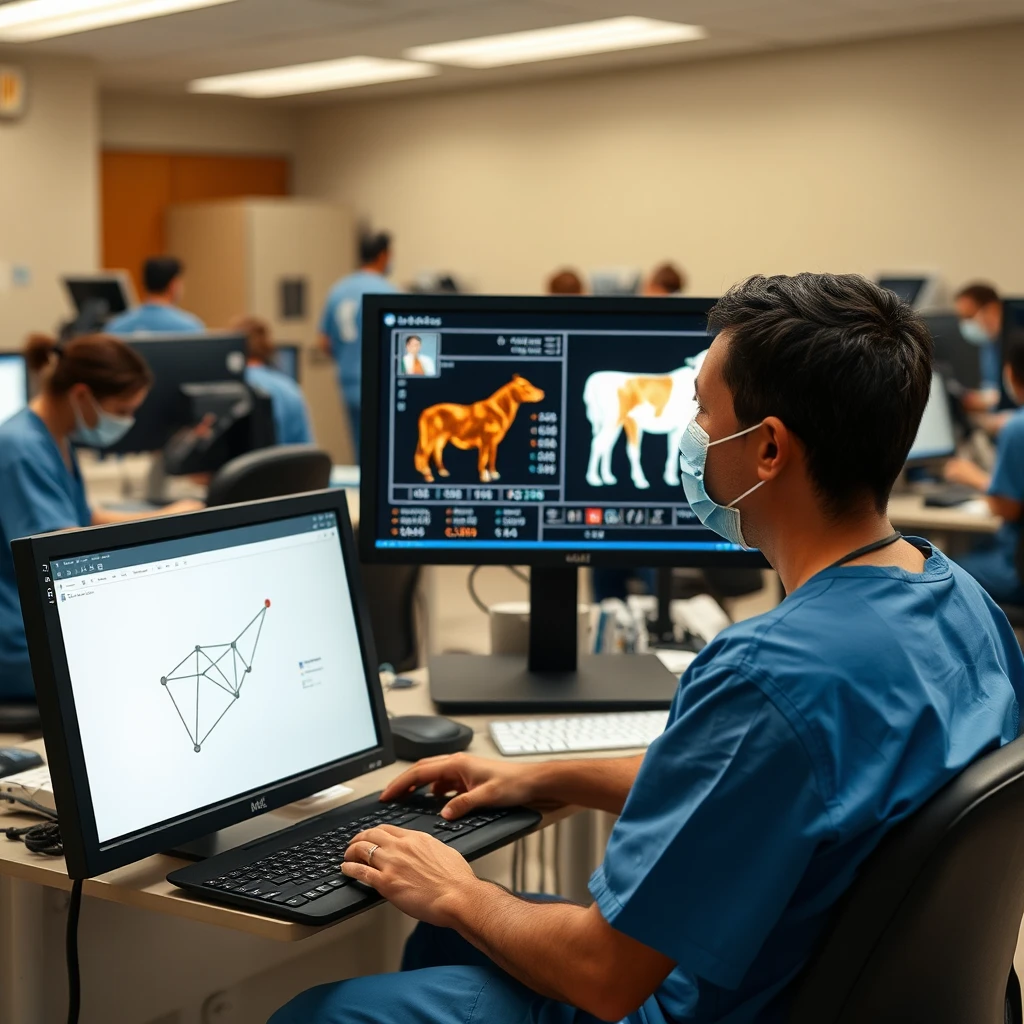 a veterinarian in scrubs sitting in front of a computer. on the screen are: a diagram of a neural network, a dog, a cow and a horse. In the background are other veterinarians working. everyone is in scrubs, noone is wearing a mask.