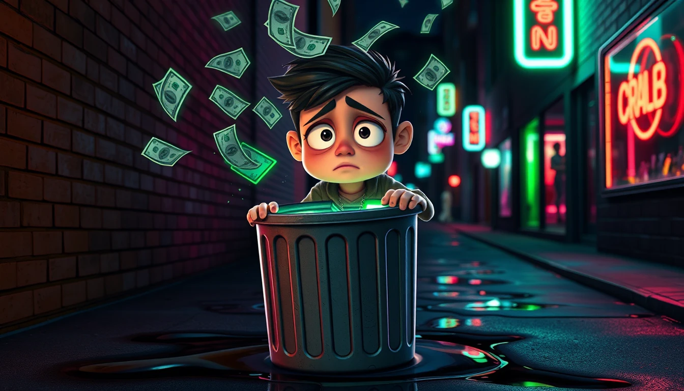 Main Character: A Pixar-style character with large, expressive eyes filled with sadness Haggard facial expression, with arched eyebrows and downturned lips Hunched posture, conveying emotional weight Wearing simple but detailed clothing, with dull colors contrasting with the neon environment Central Action: The character is in the act of throwing money into a trash can The bills float in the air, creating a trail from the character to the can Some bills are already inside the can, emitting a greenish neon glow Trash Can: A large, slightly dented metal trash can The mouth of the can is open, revealing an interior that glows with a ghostly green neon light Small particles of neon light escape from the can, as if they were missed opportunities Setting: A narrow city alley at night, with brick walls on the sides Puddles of water on the ground reflect the neon lights, creating distorted mirrors of the scene Effect Neon: Soft neon outlines around the character, emphasizing their silhouette Money bills have borders that glow neon green Neon signs in the distance at the ends of the alley create a colorful backdrop Long, dramatic shadows with colorful neon borders Lighting: Key lighting from neon lights, creating strong, colorful shadows A nearby streetlight casts a soft cone of light, adding depth to the scene Additional Details: Small coins falling from the character's pockets, each with a neon glow A small stray animal (such as a cat or mouse) watching the scene from afar, its eyes reflecting the neon lights Graffiti on the walls of the alley with money themes, illuminated by neon Overall Atmosphere: The scene should convey a sense of waste and regret The contrast between the vibrant neon colors and the character's somber emotion creates interesting visual tension The Pixar aesthetic adds a layer of empathy and emotional connection to the scene
