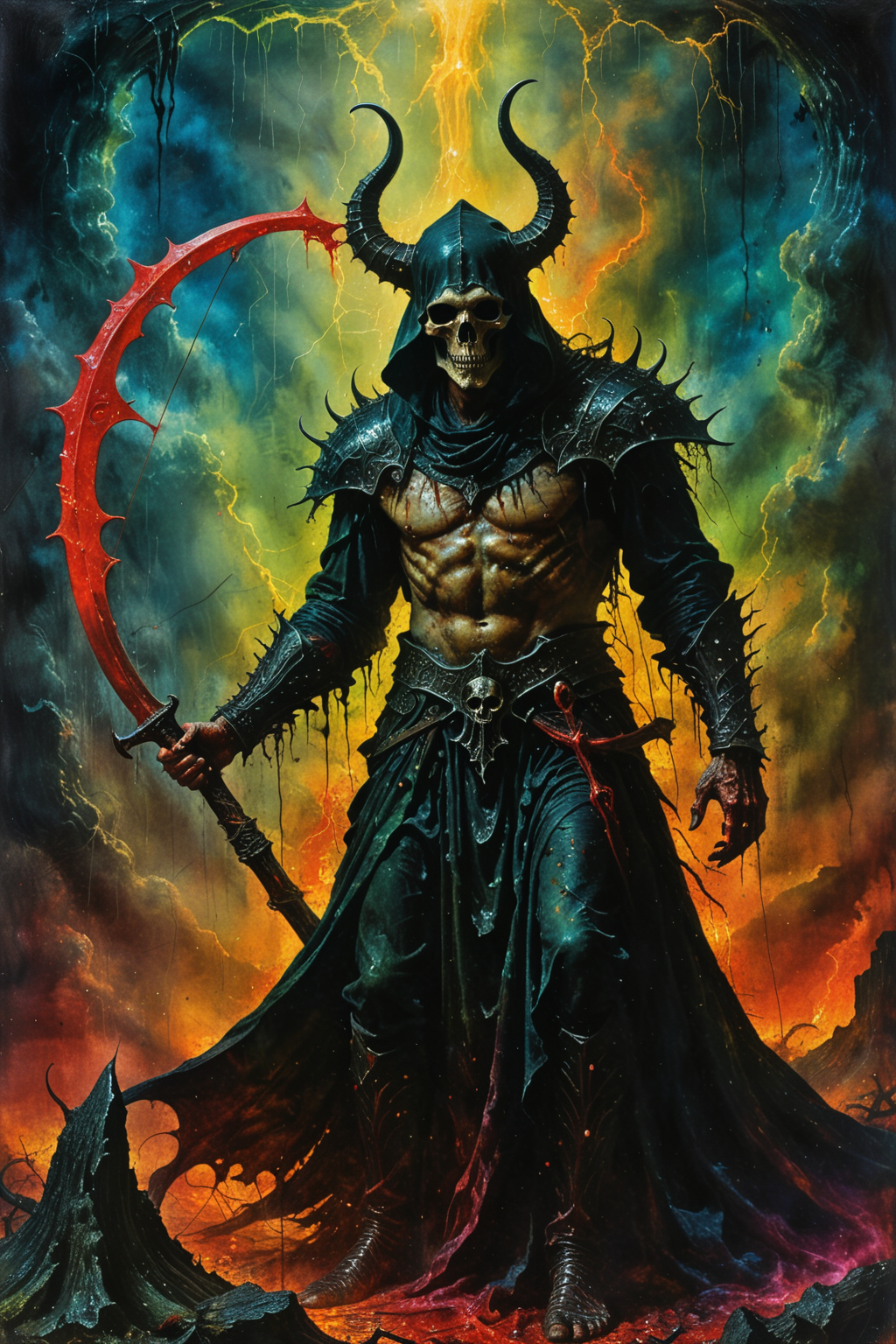 die-hard warrior, giant scythe, bone, glow, spiked armor, eldritch, rotten, noble, moonlight, blood flow, rain, occult, paranormal, insane, phantasmagorical, horror \(theme\), nightmare, light particles, pentagram, gloom \(expression\), expressive, surreal, , neon vibrant colors, psychedelic kaleidoscope, detailed brushstrokes highlighting the sharp contrasts chiaroscuro vivid color highlights, visionary, professional, detailed, dark fantasy, VHS, horror, gothic, 80's horror with vibrant colors, bold ink lines defining form against the watercolor wash of the aged paper, color contrast, <lora:Lost_In_Dreams:0.5> <lora:Gustave Dore Style:0.7> Gustave Doré Style page Asher Brown Durand, Rudolf Hausner, (close-up:1.1)