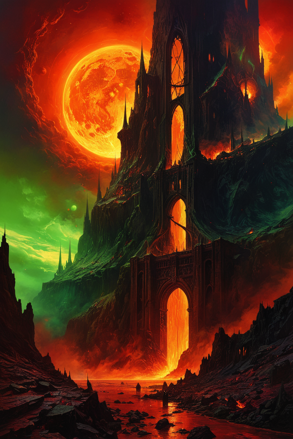 best quality, masterpiece, absurdes, a painting of a hellgate London in the of a green and red sky, giant gate, if the earth opens up under them and swallows them all up and they descend alive into the world of the dead, deep down to the hole, turbulence, concept art, gothic art, science fiction, (acid bleeding deep colors:1.4), neon colors, leaking, evil energy, no gradients, multidimensionality, complexity, black hole, neutron bombardment, decay, melting, inspired by Marc Simonetti, krenzcushart, John Berkey, kohei horikoshi, mysterious, eerie atmosphere, dark fantasy art, scary color art, Grisaille, wallpaper, devouring a planet, sky on fire, dying world, dystopian, hellscape, dark atmosphere illustration, uhd 4 k, fractal landscape, death metal album cover, (no humans:1.3), painted in high resolution, colorful, primary colors, (close-up:1.5), forced perspective, vanishing point, epic scale, deeply disturbing, , , <lora:ptm0:0.4> ptm0 <lora:John Harris Style:0.35> John Harris Style page <lora:tbh160-sdxl:0.35> style of Dan Mumford, <lora:marcXL:0.4> <lora:- SDXL - vanta-black_contrast_V3.0:0.25> <lora:EldritchCandids1.1.2:0.35>