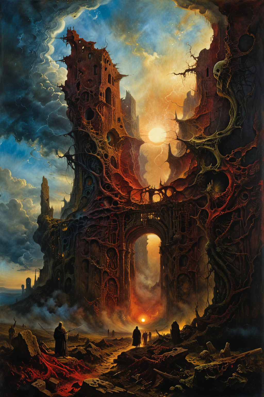 Gates of fear is open, Deep inside the violence rages, Till you dies, It takes a moment, forevermore, , masterpiece, dark fantasy, magic, glow, mysterious, poignant, disturbing, surreal, absurdes, horror theme, scary, epic scale, vast scenery, stonehenge, fibonacci, annunaki, monolith, megaliths, megastructure, eclipse, contrast sky, red sun, cloud, towering,fractal, hypnotic, colorful, dramatic, extraterrestrial, perfection, Futurism, paiting, concept art, detailed, acid deep colors, stunning color scheme, mesmerizing and otherworldly visual experience, complex, high resolution, artistic, proffesional, ((no humans)), composition explores the boundaries of reality, creating a visually arresting scene that defies conventional norms, inspired by ZdzisÅaw BeksiÅski, John Howe, and Frank Frazetta, Odilon Redon, John Atkinson Grimshaw, Arnold Böcklin, John Blanche, H.R. Giger, Alan Lee, Eduardo Rodriguez Calzado, Josef Äapek, Salvador Dali, <lora:Beksinski_SDXL_V2:0.35> <lora:Kodak Motion Picture Film Style v5_2:0.75> Kodak Motion Picture Film Style <lora:EldritchCandids1.1.2:0.3> <lora:Desolation:0.2> <lora:xl_more_art-full_v1:0.7> <lora:abysues:0.35> abysues, abx, close-up, zoomed, perspective,striking <lora:MJ52_v2.0:0.25>