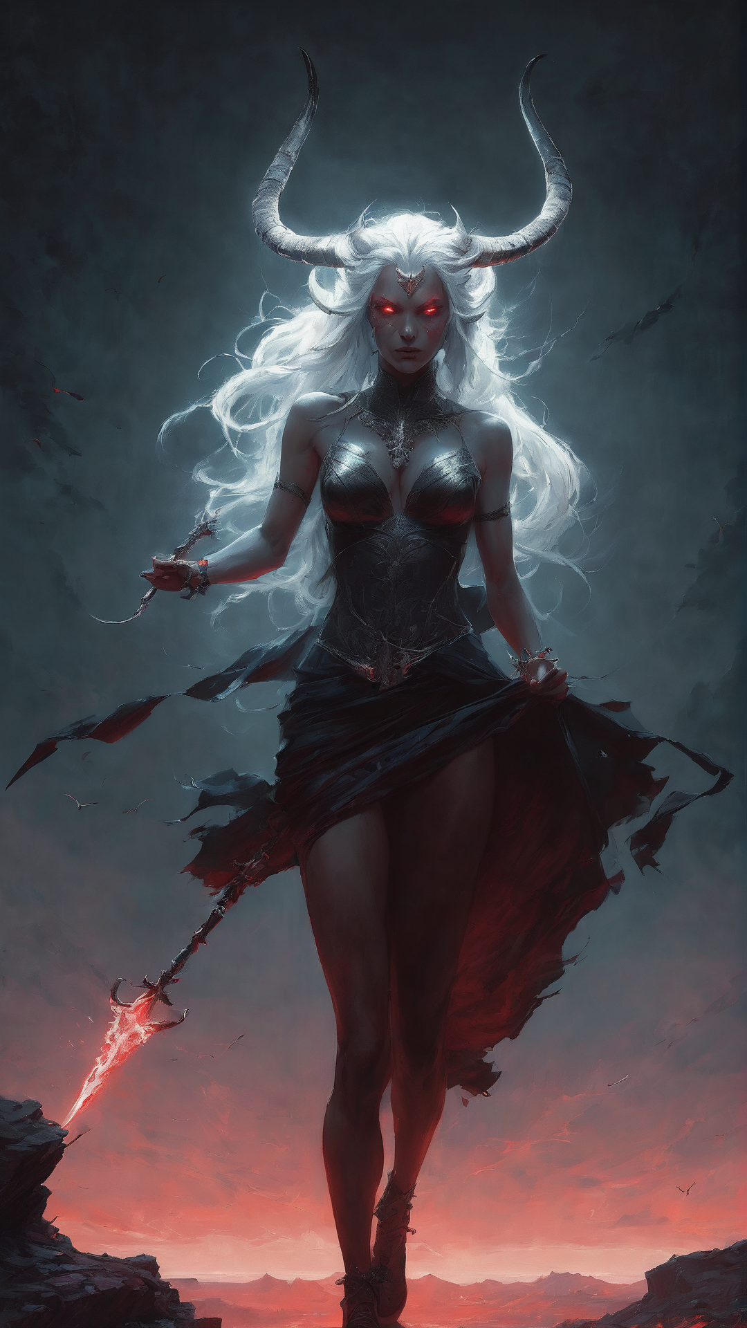 (dark magic), (grim), fantasy dynamic pose, contrapposto, action packed, by Alena Aenami, fantasy, magic, magic beams, (intricate details), (hyperdetailed), 8k hdr, high detailed, lot of details, high quality, soft cinematic light, dramatic atmosphere, atmospheric perspective red eyes, woman, succubus, white hair, (goat horns:1.1)