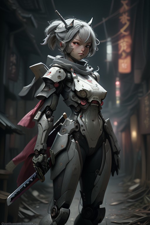 samurai, (masterpiece, best quality:1.3), intricate, 8k, HDR, wallpaper, cinematic lighting, 1girl samurai, (universe), holding sword, no humans, glowing, armor, glowing eyes, full body shot, mecha, <lora:Samurainiji:0.7>