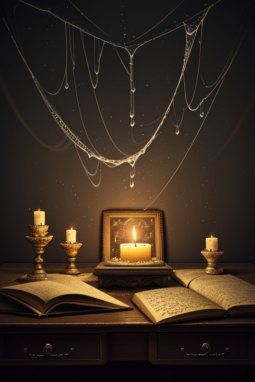 high quality, best quality, masterpiece, ,detailed_background,indoors, ancient zombie writing on a huge book, dripping candles, cobwebs, dark room, dimly lit, cockroaches on the desk.