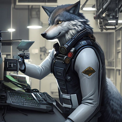 vintage_sci-fi an anthropomorphic wolf dressed as a technician or scientist