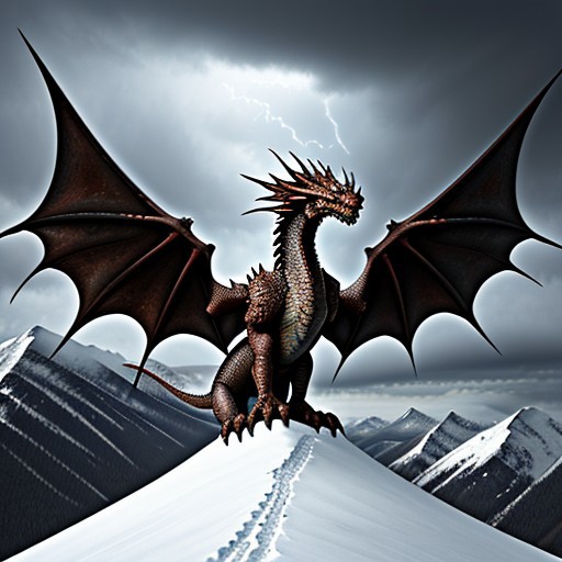 A massive, ancient dragon perched on the peak of a snow-covered mountain, its wings spread wide against the stormy sky. The dragon’s scales are a deep, iridescent black, and its eyes glow with a fierce intelligence as it surveys the land below. The wind howls around the mountain, and snow swirls through the air, but the dragon stands unmovable, its presence both majestic and terrifying as thunder rumbles in the distance