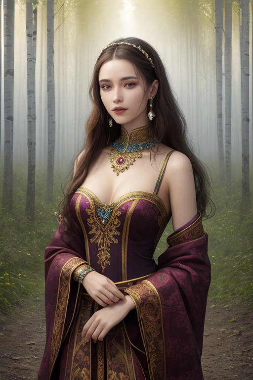 beautiful Russian girls, several, ethno costume, luxury, light background, decoration, Khokhloma, patterns, beads, flowers, silk ribbon, half-closed mouth, slight smile, embarrassment, medium breasts, hair with kokoshnik, folk estate, field, street , forest, birch, ultrarealism, detailing, realistic, photo,