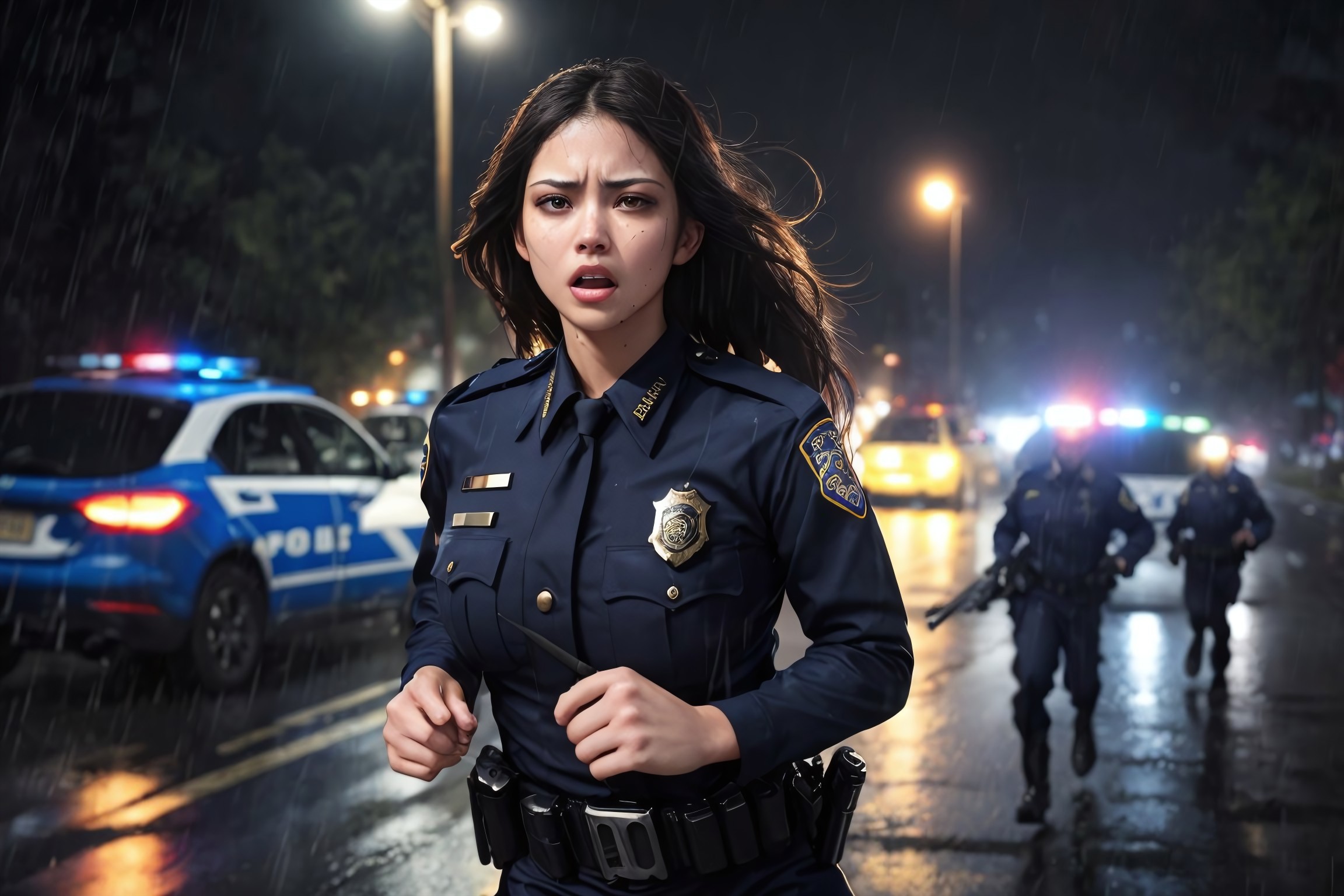 safe_pos, score_9, score_8_up, score_7_up, photo, photorealistic, woman, police uniform, raining, outdoor, night, running, gun, (breast falling out), (torn uniform), realistic shadow, dimmed light, angry expression,