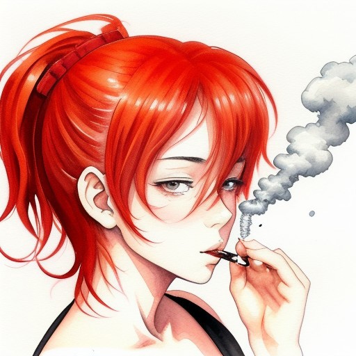 Watercolor Beautiful girl redhead anime style. Anime style. Smoking. Mature content. Black, white, red, orange colors. Shapes and dynamic in background Outlines -- --