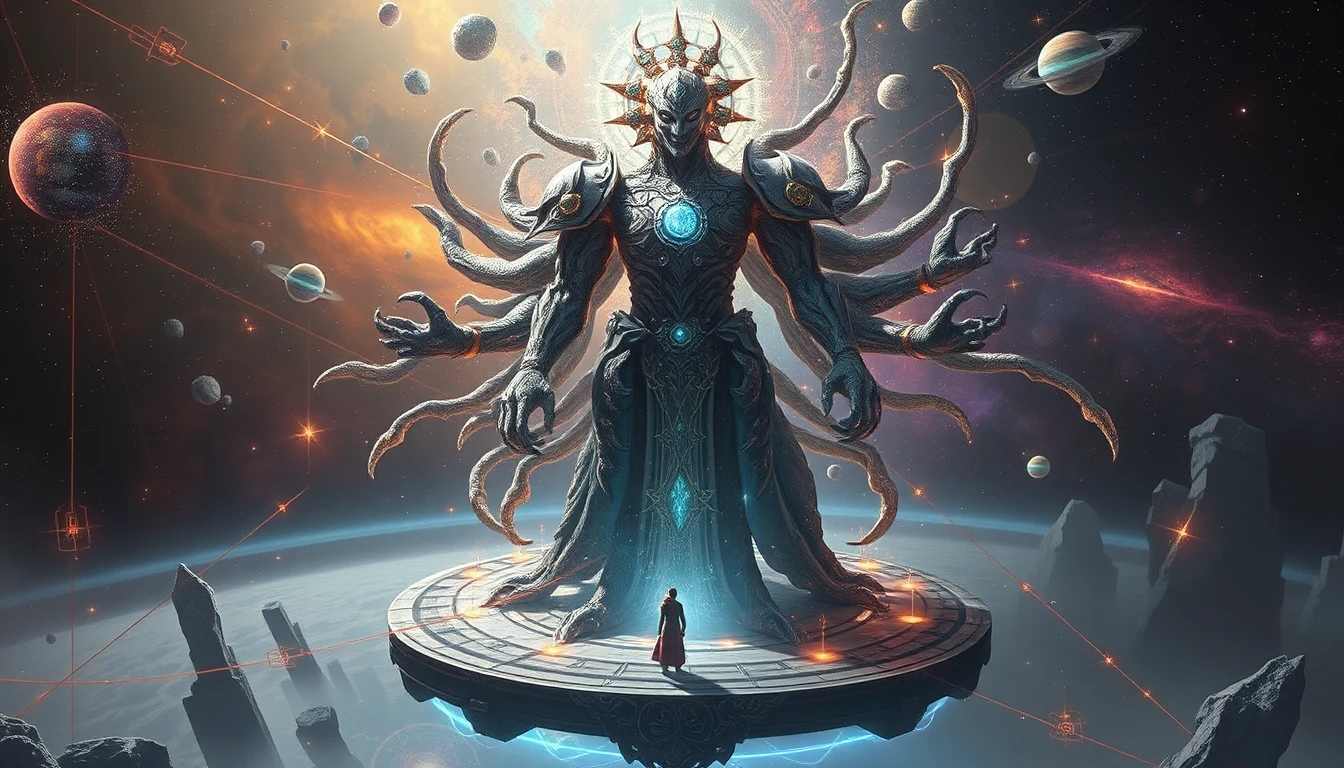 Central Figure: A colossal, ethereal entity, Aeon, occupies the center of the image Body composed of fragments of galaxies, nebulae, and stars in constant motion Multiple floating faces around the main head, each representing a different era Four main arms that branch out into countless tentacles of cosmic energy Wears armor made of living constellations and asteroid belts Environment: A circular platform floating in the void of space-time Vibrant cosmic background with distant galaxies, supernovae, and black holes visible Fragments of different realities orbiting Aeon like broken planets Rifts in the fabric of reality visible, revealing glimpses of other worlds Visual Effects: Auras of multicolored energy emanating from Aeon Timelines visible as golden threads intertwined around the figure Distortions in reality around Aeon, like ripples in a pond Small versions ghostly images of the game's protagonist floating around, representing alternate realities Additional Details: Arcane symbols and cosmic equations floating in the air "Wonders" collected during the game orbit Aeon as talismans of power A giant cosmic clock split in half in the background, symbolizing Aeon's control over time Reflections of different worlds and civilizations in Aeon's eyes Lighting and Colors: Dramatic lighting from multiple cosmic sources Vibrant and surreal color palette, with a predominance of deep blues, cosmic purples, and ethereal golds Strong contrasts between the illuminated areas and the shadows of the void of space Scale and Perspective: Slightly low angle to emphasize Aeon's colossal nature Inclusion of scale elements, such as asteroids or tiny spaceships, to demonstrate the boss's immense size