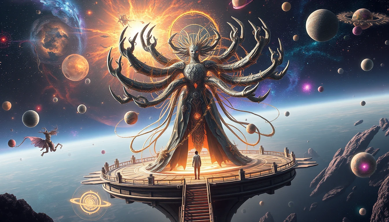 Central Figure: A colossal, ethereal entity, Aeon, occupies the center of the image Body composed of fragments of galaxies, nebulae, and stars in constant motion Multiple floating faces around the main head, each representing a different era Four main arms that branch out into countless tentacles of cosmic energy Wears armor made of living constellations and asteroid belts Environment: A circular platform floating in the void of space-time Vibrant cosmic background with distant galaxies, supernovae, and black holes visible Fragments of different realities orbiting Aeon like broken planets Rifts in the fabric of reality visible, revealing glimpses of other worlds Visual Effects: Auras of multicolored energy emanating from Aeon Timelines visible as golden threads intertwined around the figure Distortions in reality around Aeon, like ripples in a pond Small versions ghostly images of the game's protagonist floating around, representing alternate realities Additional Details: Arcane symbols and cosmic equations floating in the air "Wonders" collected during the game orbit Aeon as talismans of power A giant cosmic clock split in half in the background, symbolizing Aeon's control over time Reflections of different worlds and civilizations in Aeon's eyes Lighting and Colors: Dramatic lighting from multiple cosmic sources Vibrant and surreal color palette, with a predominance of deep blues, cosmic purples, and ethereal golds Strong contrasts between the illuminated areas and the shadows of the void of space Scale and Perspective: Slightly low angle to emphasize Aeon's colossal nature Inclusion of scale elements, such as asteroids or tiny spaceships, to demonstrate the boss's immense size