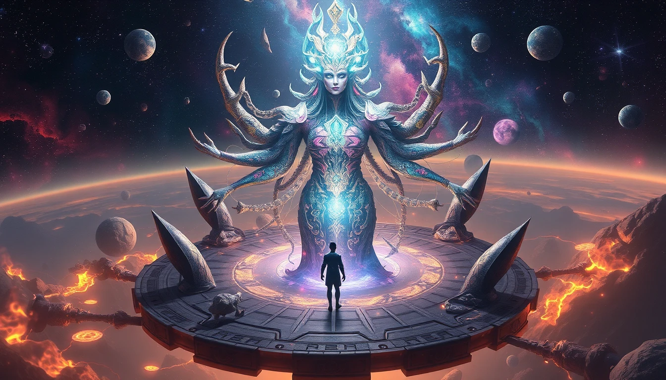 Central Figure: A colossal, ethereal entity, Aeon, occupies the center of the image Body composed of fragments of galaxies, nebulae, and stars in constant motion Multiple floating faces around the main head, each representing a different era Four main arms that branch out into countless tentacles of cosmic energy Wears armor made of living constellations and asteroid belts Environment: A circular platform floating in the void of space-time Vibrant cosmic background with distant galaxies, supernovae, and black holes visible Fragments of different realities orbiting Aeon like broken planets Rifts in the fabric of reality visible, revealing glimpses of other worlds Visual Effects: Auras of multicolored energy emanating from Aeon Timelines visible as golden threads intertwined around the figure Distortions in reality around Aeon, like ripples in a pond Small versions ghostly images of the game's protagonist floating around, representing alternate realities Additional Details: Arcane symbols and cosmic equations floating in the air "Wonders" collected during the game orbit Aeon as talismans of power A giant cosmic clock split in half in the background, symbolizing Aeon's control over time Reflections of different worlds and civilizations in Aeon's eyes Lighting and Colors: Dramatic lighting from multiple cosmic sources Vibrant and surreal color palette, with a predominance of deep blues, cosmic purples, and ethereal golds Strong contrasts between the illuminated areas and the shadows of the void of space Scale and Perspective: Slightly low angle to emphasize Aeon's colossal nature Inclusion of scale elements, such as asteroids or tiny spaceships, to demonstrate the boss's immense size