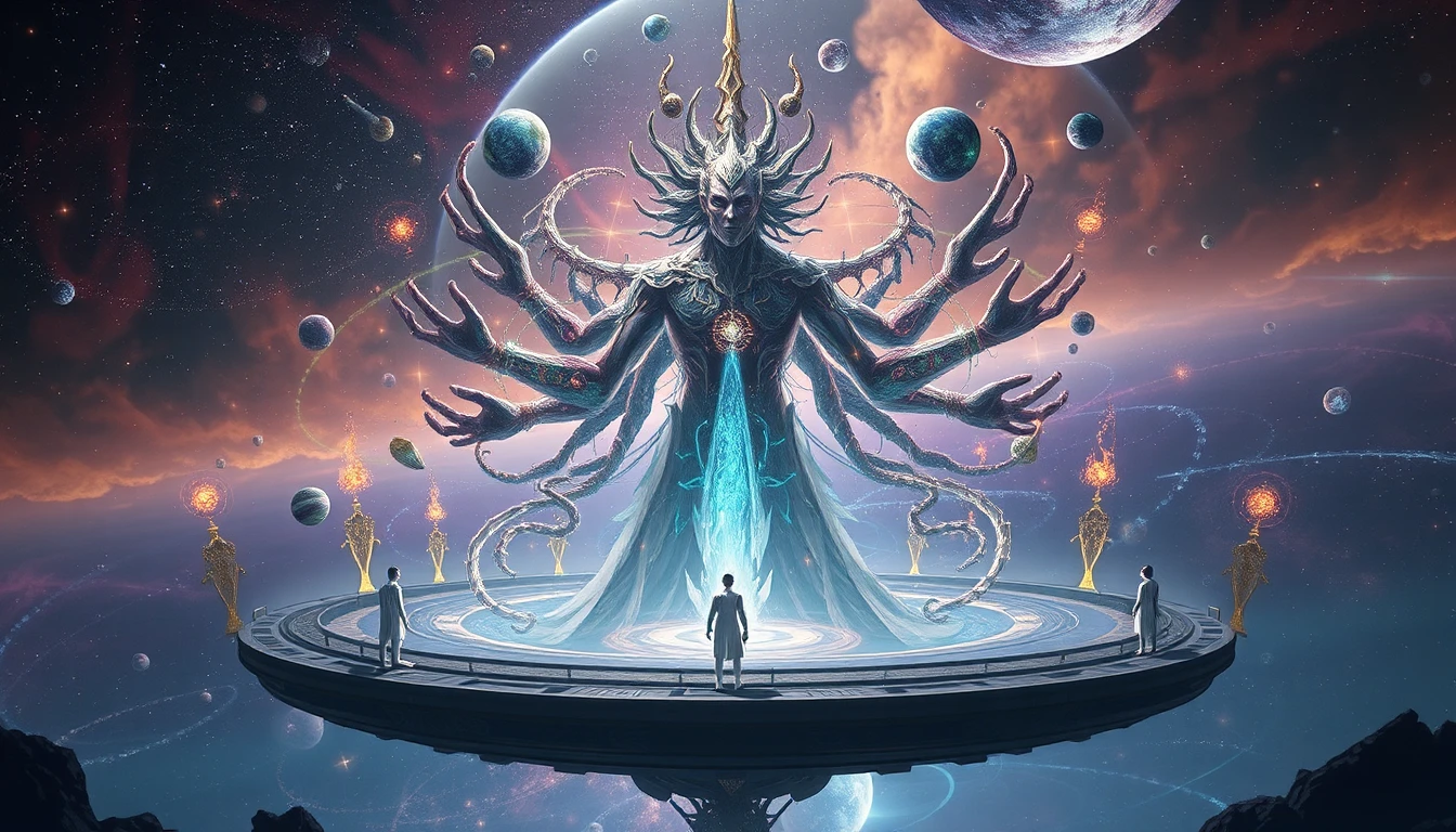 Central Figure: A colossal, ethereal entity, Aeon, occupies the center of the image Body composed of fragments of galaxies, nebulae, and stars in constant motion Multiple floating faces around the main head, each representing a different era Four main arms that branch out into countless tentacles of cosmic energy Wears armor made of living constellations and asteroid belts Environment: A circular platform floating in the void of space-time Vibrant cosmic background with distant galaxies, supernovae, and black holes visible Fragments of different realities orbiting Aeon like broken planets Rifts in the fabric of reality visible, revealing glimpses of other worlds Visual Effects: Auras of multicolored energy emanating from Aeon Timelines visible as golden threads intertwined around the figure Distortions in reality around Aeon, like ripples in a pond Small versions ghostly images of the game's protagonist floating around, representing alternate realities Additional Details: Arcane symbols and cosmic equations floating in the air "Wonders" collected during the game orbit Aeon as talismans of power A giant cosmic clock split in half in the background, symbolizing Aeon's control over time Reflections of different worlds and civilizations in Aeon's eyes Lighting and Colors: Dramatic lighting from multiple cosmic sources Vibrant and surreal color palette, with a predominance of deep blues, cosmic purples, and ethereal golds Strong contrasts between the illuminated areas and the shadows of the void of space Scale and Perspective: Slightly low angle to emphasize Aeon's colossal nature Inclusion of scale elements, such as asteroids or tiny spaceships, to demonstrate the boss's immense size