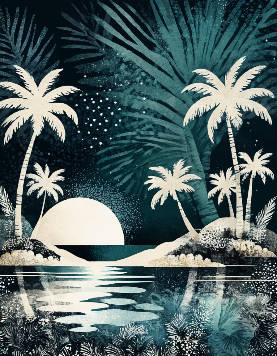 novuschroma style tiny island at night with palm trees illustration with patterns <lora:108_novuschroma_1:1>