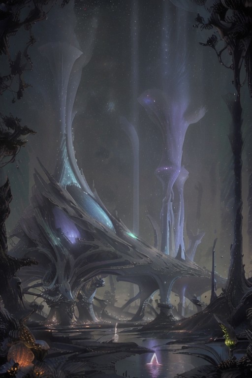 Masterpiece, best quality, lake, megastructure, spaceport, tram system, alien airships, (alien plants, glowing plants), alien landscapes, cosmic landscapes, ((asian architecture, African architecture, Arabian architecture,zahahadid,)), alien landscape, retro, ((savanna)), ((bioluminescent)), ((beautiful night sky with stars and nebula)), beautifully lit, cinematic lighting, dramatic lighting, natural lighting, naturalism, high quality