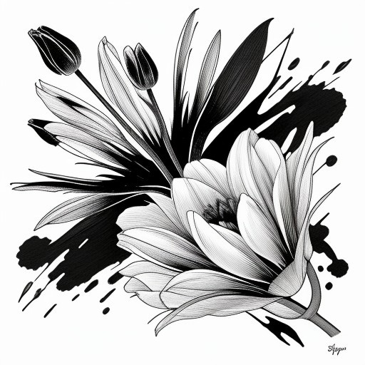 ink. Pink and Orange Tulipan Heavy dark black outlines. White background.