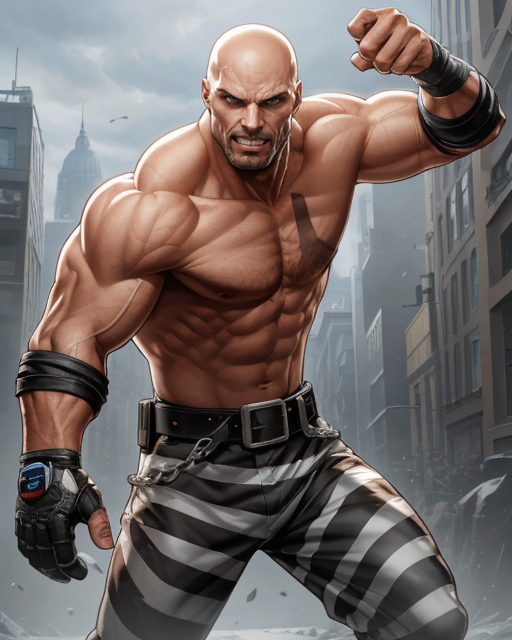 <lora:Marvel_Battleline:0.8> m4rv3lbattl3l1ne, male focus, solo, bald, topless male, pants, teeth, muscular, belt, chain, clenched teeth, abs, veins, striped, dynamic pose, medium shot, city background, epic, dynamic, cinematic, extreme sharp, extreme detailed, HD, HDR, 8K, best quality, best resolution, good quality, good resolution, Focused, Centered, Masterpiece, professional, artstation
