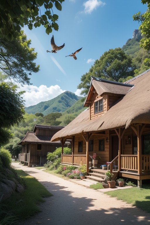 A lush mountain landscape covered in vibrant, tropical vegetation with broad-leaved trees, ferns, and bright flowers like hibiscus and orchids. The terrain is rolling, with some steep slopes and rocky outcroppings. The sky is a radiant blue with a few wispy white clouds, illuminated by the midday sun, casting bright and warm light that creates defined shadows. A narrow dirt path winds through the scene, with soft brown and reddish soil, showing light tracks and occasional patches of grass along its edges. On the left side of the path, a small, curious orange tabby cat with green eyes is sitting, watching the surroundings. Further ahead, a modest wooden cabin rests near the edge of the path, constructed with rough-hewn logs and a thatched roof, weathered by time. The door is slightly ajar, and a small porch with a rocking chair is visible. In the sky, a colorful tropical bird with a long tail—a scarlet macaw—flies by, wings outstretched, casting a faint shadow below. The sunlight glistens on its feathers, enhancing the vivid red, blue, and yellow tones as it soars above the greenery. The scene feels warm and alive, with the sounds of nature filling the air and the scent of earth and blooming flowers.
