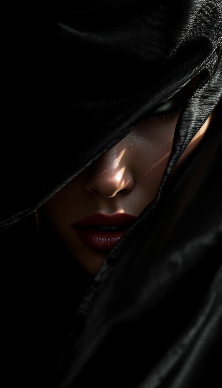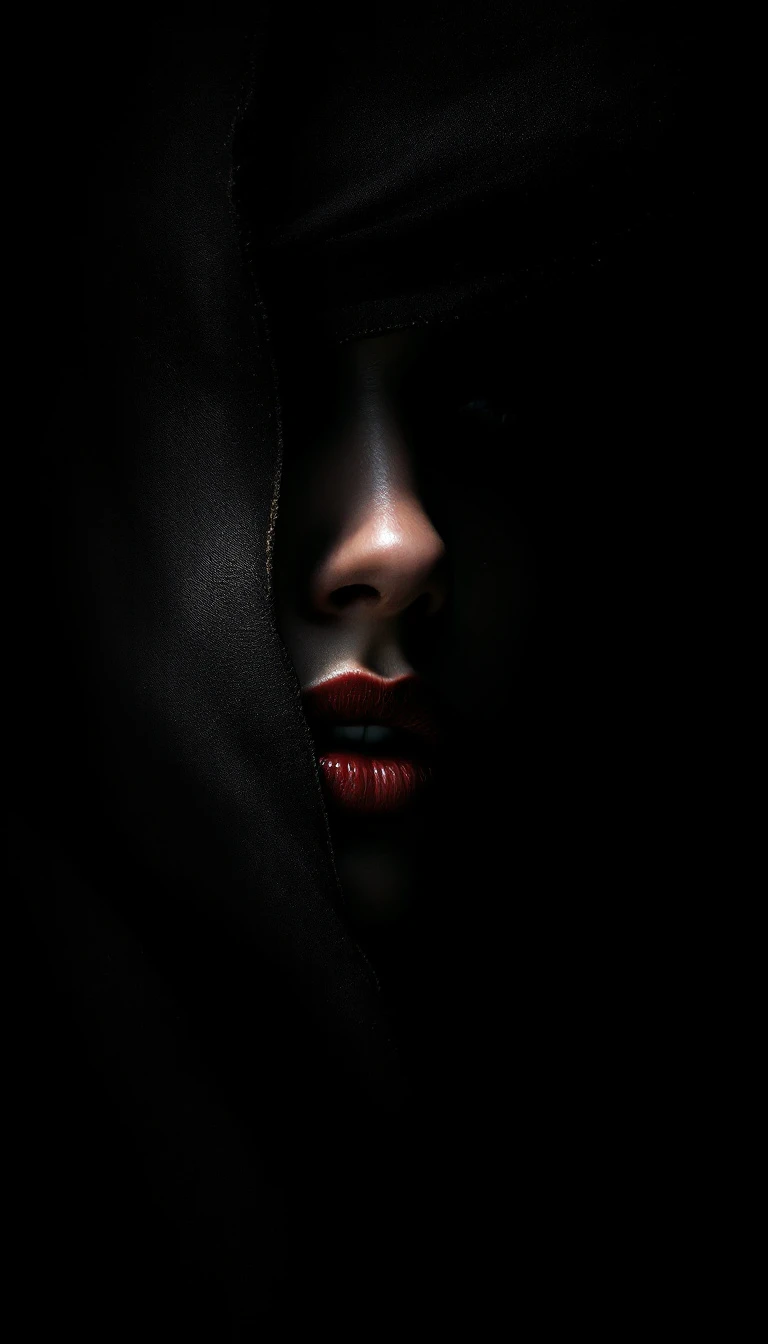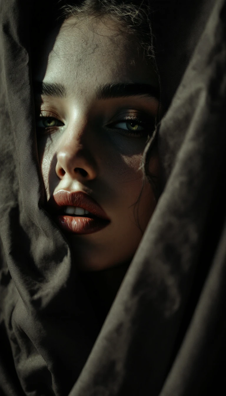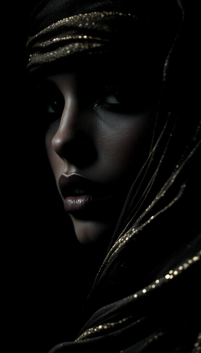 Minimalistic black background, ( pretty Egyptian Goddess face partially hidden by pharonic fabric:1.2), creating an enigmatic and mysterious atmosphere. The dark tones accentuate the dramatic effect of her lips and hair against the stark contrast between lightness and darkness in the composition. This design is perfect for conveying a sense of mystery or depth. The ultra realistic photography style accentuates the dramatic effect. Dramatic natural lighting