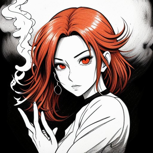 ink. Pencil black and white Beautiful girl redhead anime style. Anime style. Smoking. Mature content. Black, white, red, orange colors. Shapes and dynamic in background Outlines -- --
