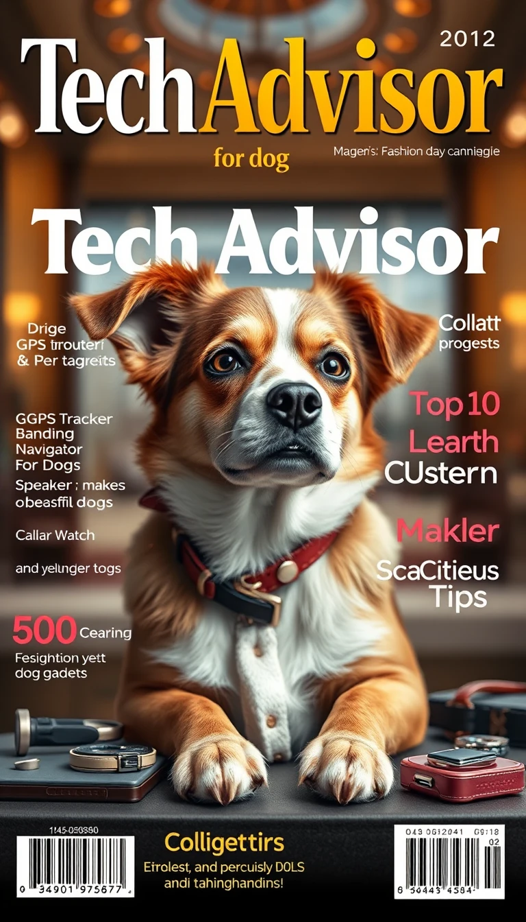 Create an ultra-realistic cover of a successful dog fashion magazine called “Tech Advisor for Dog”. Place a portrait of a dog: A fashionable dog in a modern fashion style, demonstrates and advertises the hottest dog gadgets, such as a GPS tracker navigator for dogs, a smart watch for dogs, a speaker that makes a beautiful bark for dogs, etc. The dog talks about gadgets on a luxurious background with the theme of technology, computers, smartphones, with a soft focus. The dog should be in the center of a glossy cover of a fashion magazine called “Tech Advisor for Dog” with an elegant serif font at the top. Gadgets and accessories in dog style should be neatly arranged on the cover, Include catchy headlines such as “Top 10 Latest Dog Gadgets” and “Collar Tips” using modern sans serif fonts. Add a barcode in the bottom corner and the date, year in the top corner. High resolution image with vivid colors and soft natural lighting, in portrait orientation.