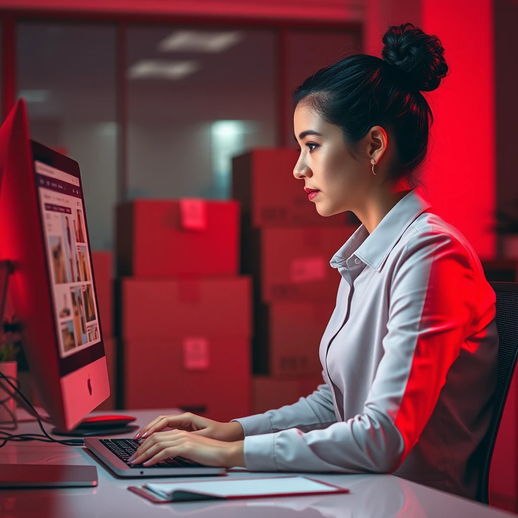 A businesswoman in front of her computer looking at her online store, behind her are packaging boxes. Ultra realistic, red tones in the environment