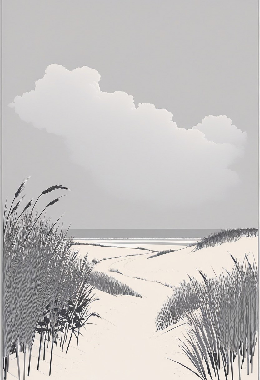 detailxl, 1NK, ArsMJStyle, Minimalist Vector Art, lineart, flat colors, BREAK, beach, reeds, horizon, grey clouds