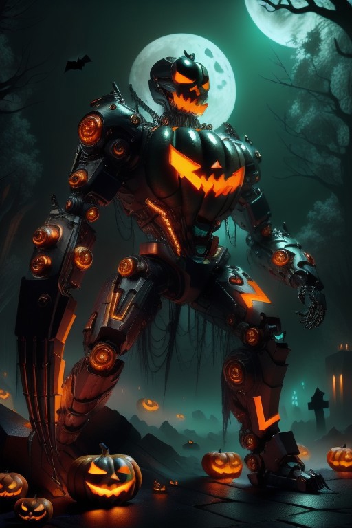 ((masterpiece)), ((best quality)), 8k, ultra-detailed, half-body photo of a futuristic android robot with a pumpkin head, metallic and armored body, (cyberpunk Halloween theme), glowing orange jack-o'-lantern eyes, (sinister carved grin on the pumpkin), high-tech wires and circuits running through the pumpkin head, sharp metallic claws, armor detailed with (black and neon orange colors), (spooky engravings like spider webs and skulls) on the armor, glowing neon accents, fog emanating from joints, dynamic and menacing pose, (simple background: eerie cemetery with crooked tombstones or haunted forest), cinematic lighting with strong shadows and glowing fog swirling around, full moon in the dark sky casting pale light, creepy mist covering the ground, jack-o'-lanterns illuminating the scene from a distance, capturing a dark and spooky atmosphere, blending horror and advanced technology, sharp focus, detailed background,real robot,epic mecha, chrometech, halloweentech