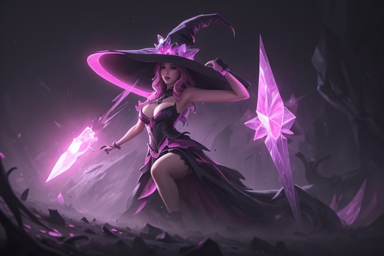 <lora:LoL_Splash_Style:0.65> lol_5plash, cute witch, big hat, pink dress, cleavage, epic, dynamic, cinematic, colorful, vivid, neon, crystals, magic, extreme sharp, extreme detailed, HD, HDR, 8K, best quality, best resolution, good quality, good resolution, Focused, Centered, Masterpiece, professional, artstation