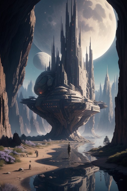 space planet, sun, moon, stars, (big rocks:0.9), (ripples, reflections:0.9), spatial futuristic castle, (small river pond:0.8), space forest, (space village:1.2), (stunning nature aquatic environment:0.8), spaceship, (unknown exotic land:0.9),) (nice alien civilization), (beautiful space fantasy scifi futuristic landscape:0.9, (very detailed:1.2), (best quality:1.2), sharp focus, high contrast, cinematic lights, backlight, shadows, (lens flare:0.4), (vibrant colors, colorful):0.7, (Lilac flowers:0.9) and leaves, <lora:Detail Tweaker LoRA add_detail:0.8><lora:depth_of_field_slider_v1:5> <lora:SDXLrender_v2.0:0.9> <lora:1970RetroFuturism:0.3> 1970retrofuturism