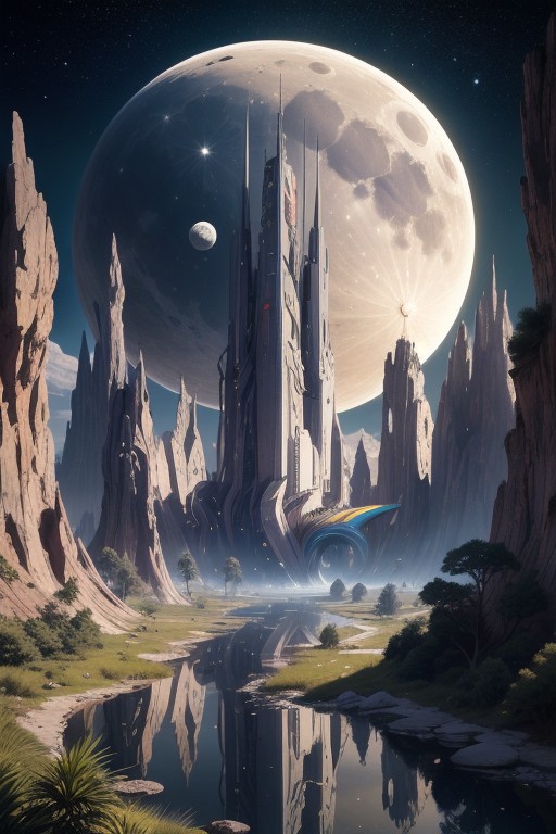space planet, sun, moon, stars, (big rocks:0.9), (ripples, reflections:0.9), spatial futuristic castle, (small river pond:0.8), space forest, (space village:1.2), (stunning nature aquatic environment:0.8), spaceship, (unknown exotic land:0.9),) (nice alien civilization), (beautiful space fantasy scifi futuristic landscape:0.9, (very detailed:1.2), (best quality:1.2), sharp focus, high contrast, cinematic lights, backlight, shadows, (lens flare:0.4), (vibrant colors, colorful):0.7, (Lilac flowers:0.9) and leaves, <lora:Detail Tweaker LoRA add_detail:0.8><lora:depth_of_field_slider_v1:5> <lora:SDXLrender_v2.0:0.9> <lora:1970RetroFuturism:0.3> 1970retrofuturism