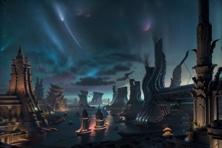 Masterpiece, best quality, futuristic city, city, city street, ocean, harbour, boats in harbour, cliffs, airships, (alien plants, glowing plants), cosmic landscapes, ((asian architecture, African architecture, Arabian architecture)), alien landscape, ((bioluminescent, beautiful night sky with stars and nebula)), busy, active, populated, beautifully lit, cinematic lighting, dramatic lighting, natural lighting, naturalism, birds eye view, high quality, 4k, 8k, OverallDetail