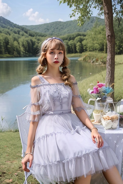 (masterpiece, best quality:1.2),illustration,8k,hd,1 girl,blonde hair,very long hair,solo,(collarbone:1.2),looking at viewer,twintails, picnic,white dress,jewelry,earrings,hairband,frills,big breasts,outdoors,(day, lake:1.5),extremely detailed dress,crystalstexture skin,front view,