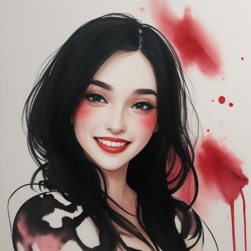 Watercolor (red and black only). Ink Splotches. Woman smiling