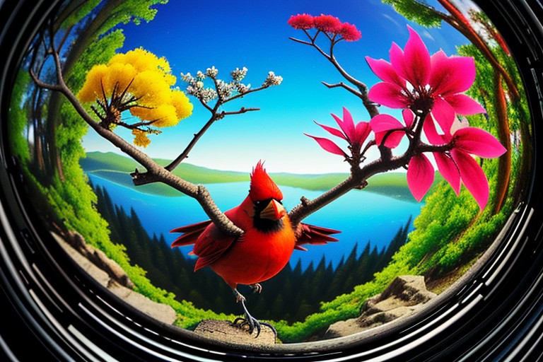 Animal, bird, branch, fisheye lens, close up, masterpiece, highly detailed, outdoors, day, blue sky, red, cardinal, vibrant colors, surreal, psychedelic,