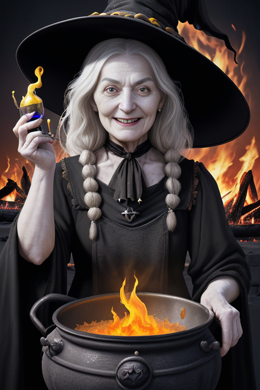 realistic portratit of an old woman, witch, long black hair, witch hat, yellow eys, pale face, black vests, night, ((cooking a potion in a cauldron over a raging fire)), evil smile, at dark florest