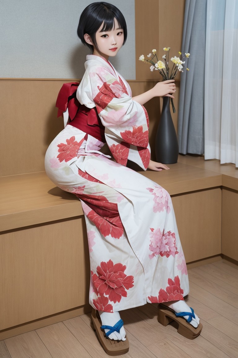 safe_pos, 1girl,solo,perfect face,look at viewer, japanese clothes, kimono, solo, flower, indoors, vase, black hair, wooden floor, floral print, short hair, curtains, chair, sash, tabi, obi, sandals, full body, breasts, from side, print kimono, geta, sitting, leaning forward, masterpiece,best quality,highly detailed,