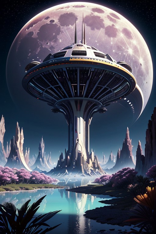 alien planet, a partially shattered planet in the night sky, moon, stars, (crystaline spires:0.9), (ripples, reflections:0.9), spatial futuristic spaceport, (waterfalls:0.8), space forest, oversized flora, (alien plants:1.2), (stunning nature aquatic environment:0.8), spaceships, (unknown exotic land:0.9),) (alien civilization), (beautiful space fantasy scifi futuristic landscape:0.9, (very detailed:1.2), (best quality:1.2), sharp focus, high contrast, cinematic lights, backlight, shadows, (lens flare:0.4), (vibrant colors, colorful):0.7, (Lilac flowers:0.9) and leaves, <lora:Detail Tweaker LoRA add_detail:0.8><lora:depth_of_field_slider_v1:5> <lora:SDXLrender_v2.0:0.9> <lora:1970RetroFuturism:0.3> 1970retrofuturism