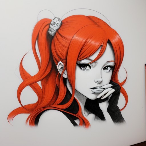 ink. Pencil black and white Beautiful girl redhead anime style. Anime style. Smoking. Mature content. Black, white, red, orange colors. Shapes and dynamic in background Outlines -- --
