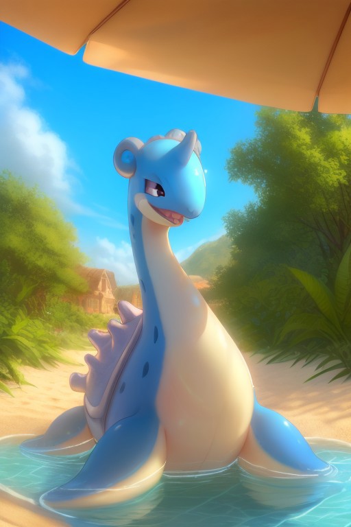 A happy cute, LaprasXL, Lapras, Pokémon, looking to the side, portrait, (solo:1.3), head focus, in a lush beach, surrounded by colourful flowers and vibrant plants, with a clear blue sky overhead. Adorable, heart warming, nature, cheerful, detailed, bright colours, friendly expression, shiny, eco-friendly, environmental, (good anatomy), summertime, sunlight, shadows, digital art, whimsical, playful, intricate details, high resolution, photorealistic, joyful, gentle, soft lighting, charming, outdoor setting, cartoonish style, enchanting, vivid, appealing, character design, imaginative, family-friendly, [photography, realistic, photorealistic, (8k), (highly detailed), cinematic lighting, intricate details, (high resolution), award-winning, correct focus, realistic, realistic lighting, (highly detailed), masterpiece], ((Cinematic Still-Shot))