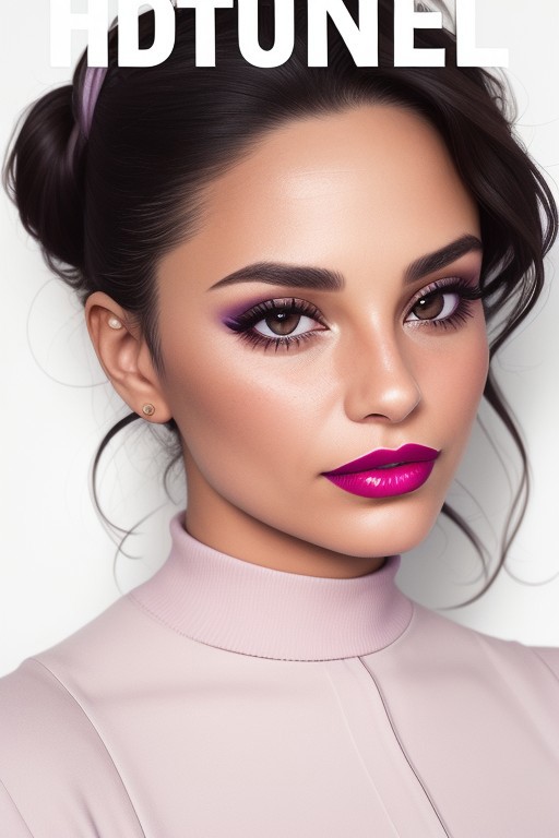 A magazine cover featuring a stunning supermodel with the bold headline "HOTTAKE" in large letters, accompanied by smaller text and a barcode. The cover image showcases a single girl with realistic features: she has black hair and striking brown eyes, detailed with mascara and delicate eyeshadow. Her face has a straight nose, thin lips, and parted lips revealing her teeth, all accentuated with lilac lipstick and a touch of blush. Her makeup is subtle and flawless, complementing her perfect skin. She wears a white blouse that highlights her collarbone. eva_nut,