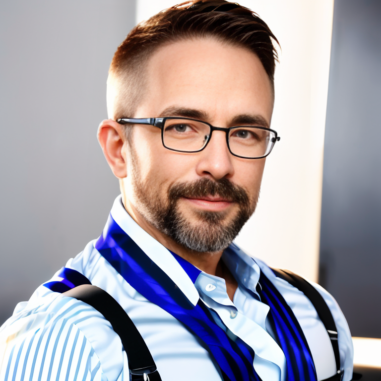 (RAW photo), <lora:DirkCaber:0.85>, dirkcaber, portrait, close-up, (mature male:1.1), facing viewer, (straight-on:1.2), muscular male, absurdres, simple background, glasses, striped, dress shirt, suspenders