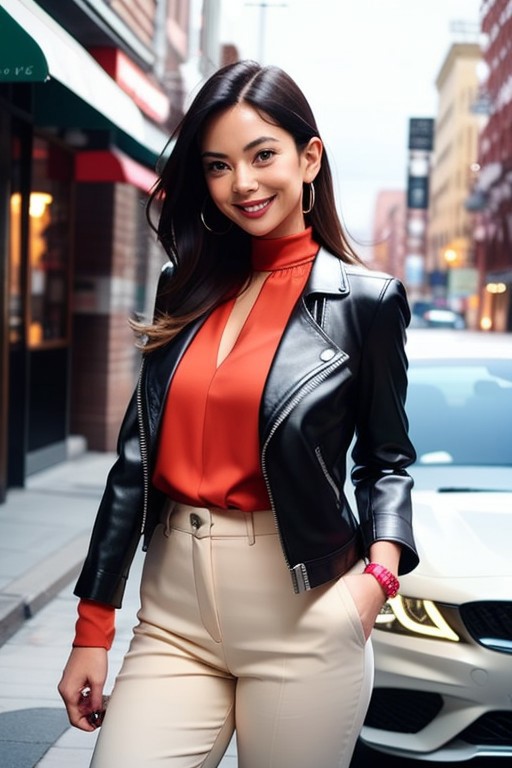 Standing next to a car, this beautiful lady flirtingly smiles at viewer while wearing an unbuttoned blouse and a leather jacket, city street, downtown, dim daylight, cloudy, flechera