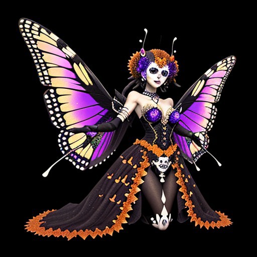 "Create a hyper-stylistic image of a butterfly with its wings splayed out in a dramatic, symmetrical pose. The wings themselves are a masterpiece of Halloween-themed design, with intricate, swirling patterns that resemble skulls and pumpkins. The skulls are delicate and ornate, with tiny details and textures that give them a lifelike quality. The pumpkins are similarly detailed, with ridges and crevices that make them look like they were plucked straight from a patch. The background is a deep, rich black, which allows the vibrant colors of the wings to pop and shine. Incorporate intricate details and textures to bring the butterfly and its wings to life, with a focus on capturing the sense of wonder and magic that comes with Halloween." highest-Quality, intricate details, visually stunning, Masterpiece