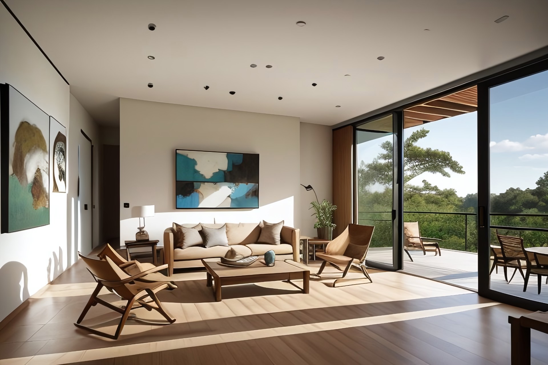 A serene Oriental Minimalistic duplex interior view, combining traditional elements with modern art movements such as post-painterly abstraction, hard-edge painting, and geometric abstraction. The design emphasizes structural clarity and dynamic composition, blending sculptural forms and geometric accents with a minimalist approach. Clean lines and open spaces enhance the calm atmosphere, while non-representational art introduces a sense of movement and depth. The interior integrates natural materials like wood, bamboo, metal, fire, earth, and water, grounding the space in the traditional elements of Oriental design. These materials are complemented by bold color fields and sharp-edged geometric forms that reflect the modern art influences. Calligraphy serves as a cultural touchpoint, subtly blending with the non-representational art to maintain the balance between tradition and modernity. Sculptural forms are used to create focal points in the space, drawing attention to the dynamic contrasts between sharp geometric lines and organic materials. Natural light plays a crucial role, casting shadows across the minimalist interior and enhancing the interplay between solid, abstract forms and soft natural textures. The overall design balances simplicity with artistic expression, resulting in a tranquil yet visually stimulating duplex interior that merges tradition with modern art.