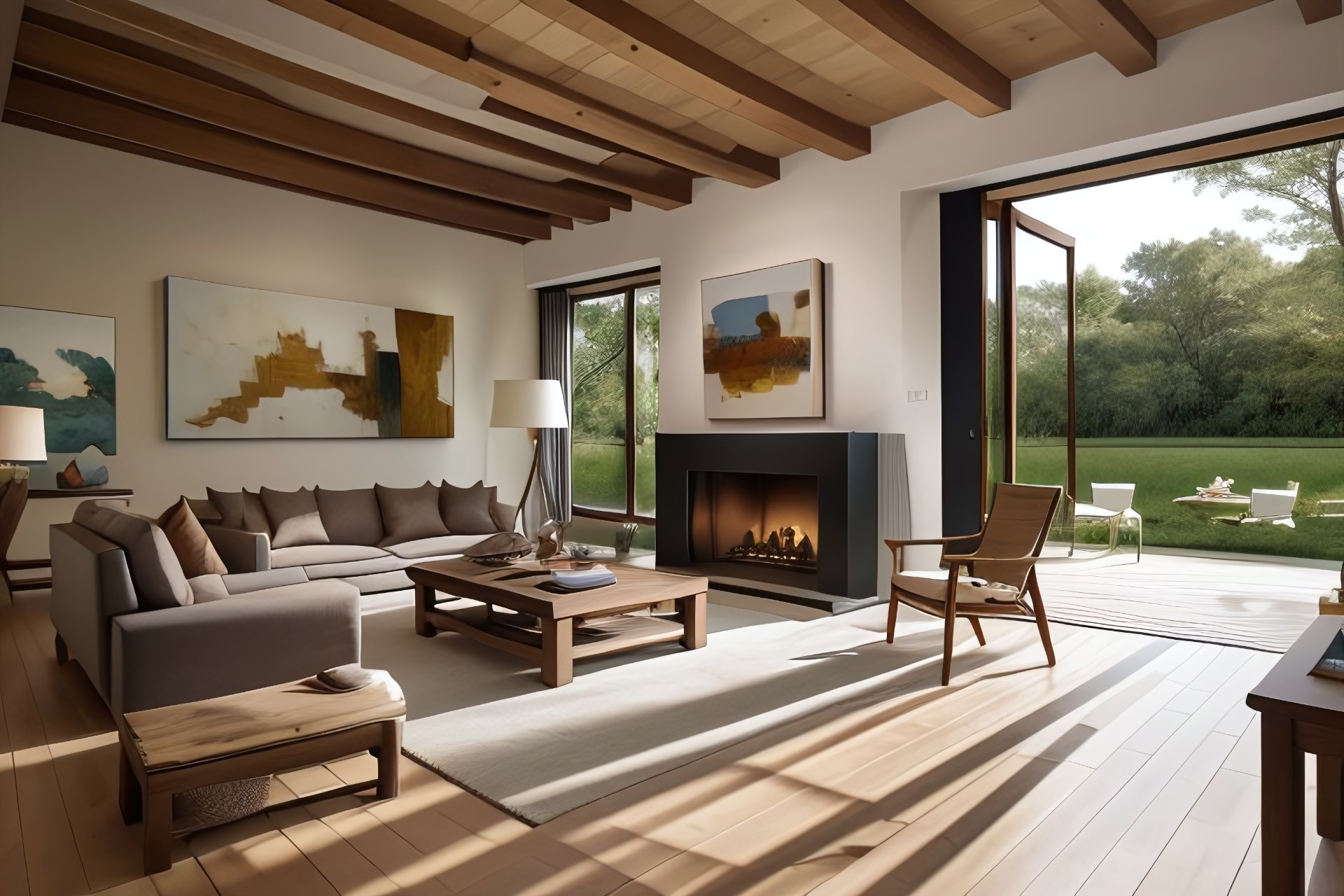 A serene Oriental Minimalistic duplex interior view, combining traditional elements with modern art movements such as post-painterly abstraction, hard-edge painting, and geometric abstraction. The design emphasizes structural clarity and dynamic composition, blending sculptural forms and geometric accents with a minimalist approach. Clean lines and open spaces enhance the calm atmosphere, while non-representational art introduces a sense of movement and depth. The interior integrates natural materials like wood, bamboo, metal, fire, earth, and water, grounding the space in the traditional elements of Oriental design. These materials are complemented by bold color fields and sharp-edged geometric forms that reflect the modern art influences. Calligraphy serves as a cultural touchpoint, subtly blending with the non-representational art to maintain the balance between tradition and modernity. Sculptural forms are used to create focal points in the space, drawing attention to the dynamic contrasts between sharp geometric lines and organic materials. Natural light plays a crucial role, casting shadows across the minimalist interior and enhancing the interplay between solid, abstract forms and soft natural textures. The overall design balances simplicity with artistic expression, resulting in a tranquil yet visually stimulating duplex interior that merges tradition with modern art.