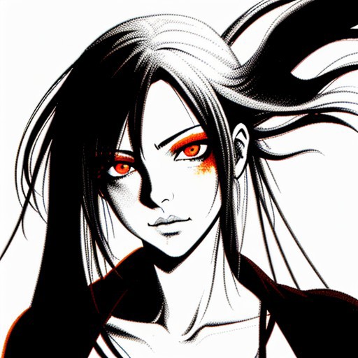 Anime style Girls. Black and white and red. red eyes. White background.Unfinished 70%. Strong heavy thick dark black lines. Heavy strokes. HEavy strong orange outline around girl. orange outline around.