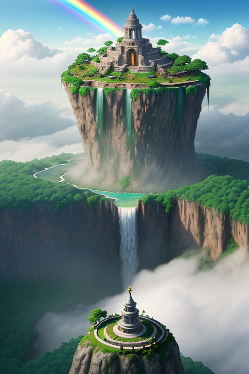 A magical floating island suspended in the sky, with waterfalls cascading down into the clouds below. The island is lush and green, covered in vibrant flowers and towering trees. Small bridges connect different parts of the island, and in the center stands an ancient stone temple. Birds fly through the mist, and the sunlight filters through the clouds, creating rainbows in the waterfalls